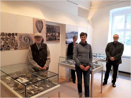 mit Lutz Koch, Anne Peter, Dr. Bärbel Jäger und Dr. Hans-Dieter Dörner (von links) präsentieren die wertvolle Fossilien-Sammlung; Foto: Privat / WP
