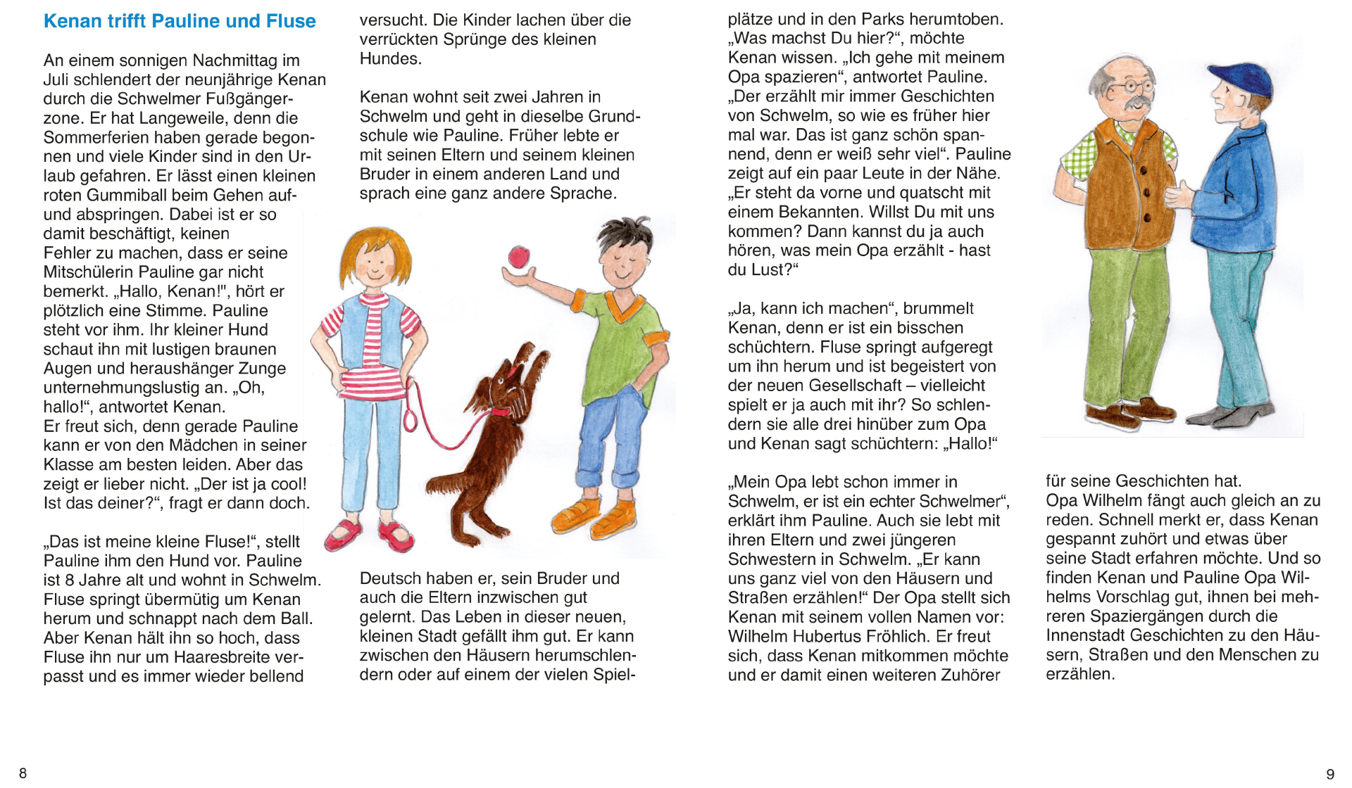 Begleitet werden die geschichtlichen Informationen durch eine Rahmenhandlung: Der neunjährige Kenan trifft bei einem Stadtbummel auf seine Mitschülerin Pauline und deren Großvater Wilhelm. Schnell ist sein Interesse geweckt, zusammen mit Pauline und dem Großvater auf Spaziergängen mehr über Schwelm und seine Geschichte zu erfahren. Fluse, Paulines quicklebendiger Hund, tobt dabei herum und freut sich über neue, unbekannte Ecken der Stadt. Während der Sommerferien erkunden die vier so auf ihren Streifzügen die Stadt Schwelm und lernen deren spannende Geschichte kennen.