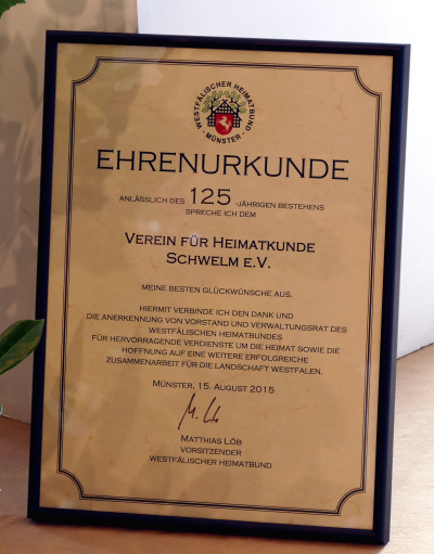 Der Verein für Heimatkunde richtete am Vormittag einen Festakt für geladene Gäste aus. Es sprachen u.a. Bürgermeister Jochen Stobbe, Schwelms Ehrenbürger Wilhelm Erfurt, Anne Peter als Vorsitzende des Vereins für Heimatkunde, Dr. Ingo Fiedler (Westfälischer Heimatbund), Verena Burhenne vom Westfälischen Museumsamt Münster und Kulturbüroleiterin Gabriele Weidner.