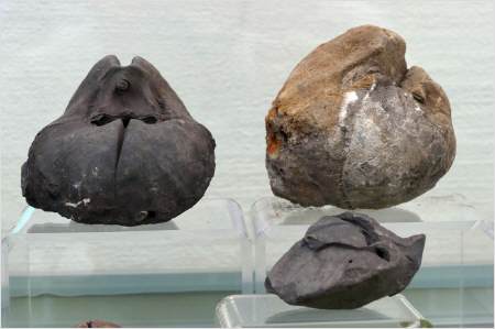 Die drei Brachiopoden (Armfüßer) sind ca. 385 Millionen Jahre alt und stammen aus der Erdgeschichte unserer Region, (Foto: A. Kowalewski)