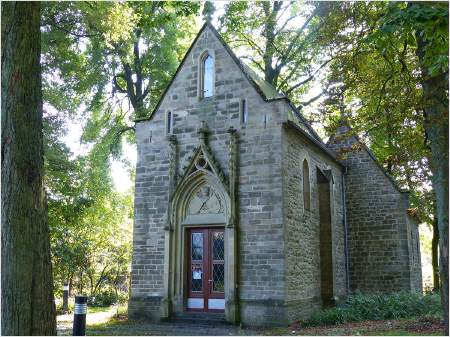 Die Kapelle ist aus Bruchsteinmauerwerk errichtet und besteht aus zwei hintereinander, leicht versetzten Baukörpern mit steilen Dächern. Beide sind mit zu der Zeit beliebten neugotischen Zierelementen versehen. Als Vermittler zwischen dem Außen und dem Innen kommt dem Portal eine besondere Bedeutung zu. Daher ist es aus hellem Sandstein und zudem kunstvoll mit Schmuckelementen ausgearbeitet. In seinem Giebelfeld stehen die Wappen der beiden Familien, denen Friederike von Elverfeldt angehörte: Das Wappen Elverfeldt links und das der Familie ihrer Eltern, von Schwachenberg, rechts. Verbunden werden die beiden Schilde durch ein steinernes Band mit der Jahreszahl 1860, dem Entstehungsjahr der Kapelle.
