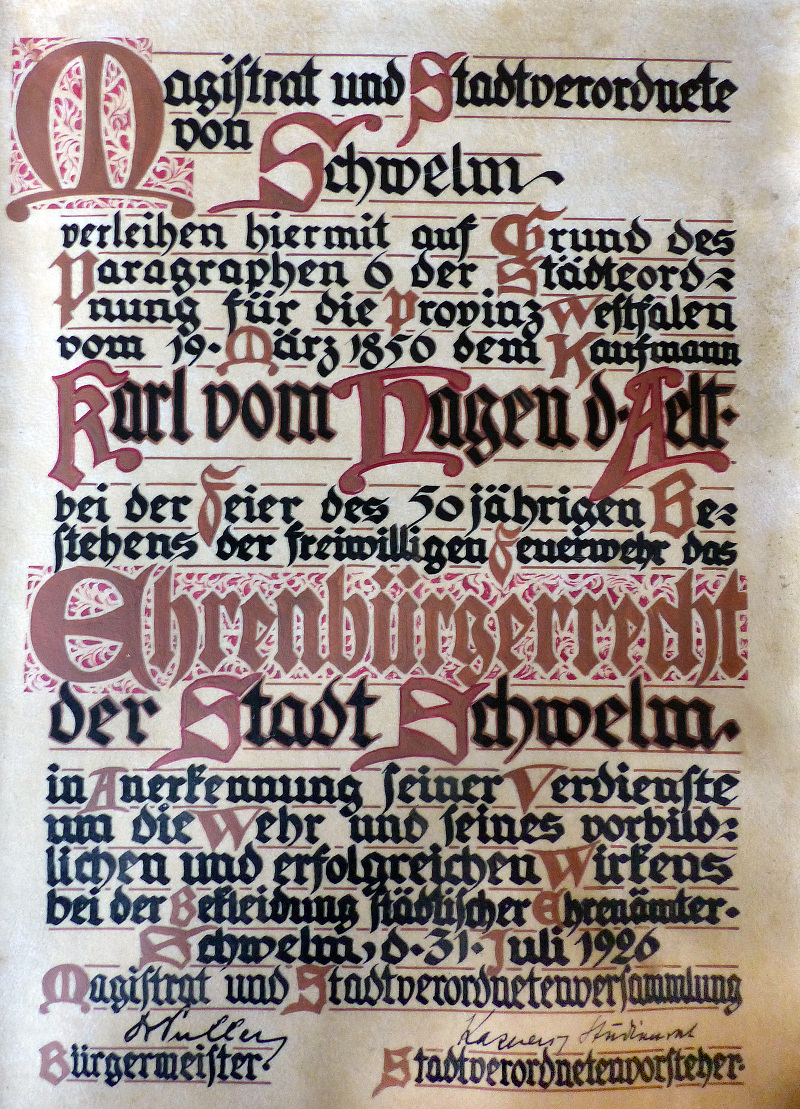 Die Freiwillige Feuerwehr selbst wurde am 16. August 1876 gegründet. Carl vom Hagen war während seiner Laufbahn Hauptmann der Steigerabteilung, Oberbrandmeister, Branddirektor, Kreisbrandmeister, Ehrenbrandmeister, Ehrenbranddirektor sowie Inhaber des Feuerwehrenkreuzes 1. Klasse.