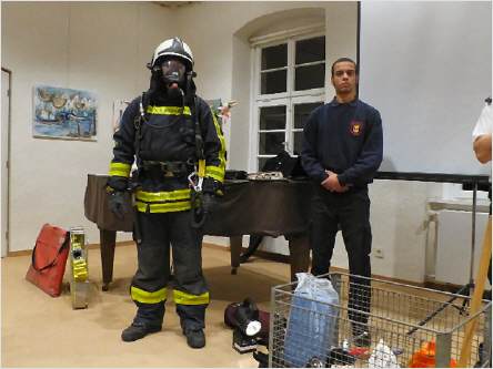 „Feuer!“ – Die Stadtbrände und die Feuerordnung von 1825 war eines der Themen in der Lesereihe „Altes neu entdeckt! Historische Literatur – moderne Themen!“ in 2014 im Haus Martfeld. Die heutige Ausrüstung der Feuerwehr bei Bränden demonstrierte eindrucksvoll Matthias Jansen, Leiter der Schwelmer Feuerwehr, mit seinen Kollegen. (Foto: A. Peter, 2015).