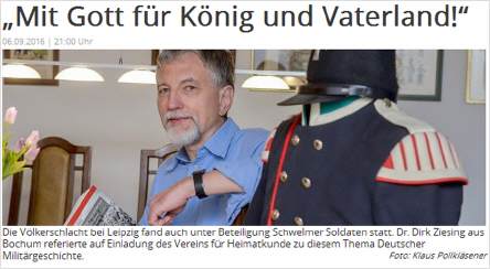 Schwelm. Unter das Thema „Freiwillige aus Schwelm im 1. Landwehr-Infanterie-Regiment 1813 - 1815“ hatte Dr. Dirk Ziesing, Bochum, seinen Vortrag über die Zeit der Befreiungskriege in und um Schwelm gestellt. Die Veranstaltung fand auf Einladung des Vereins für Heimatkunde Schwelm in der Sparkasse am Bürgerplatz statt...