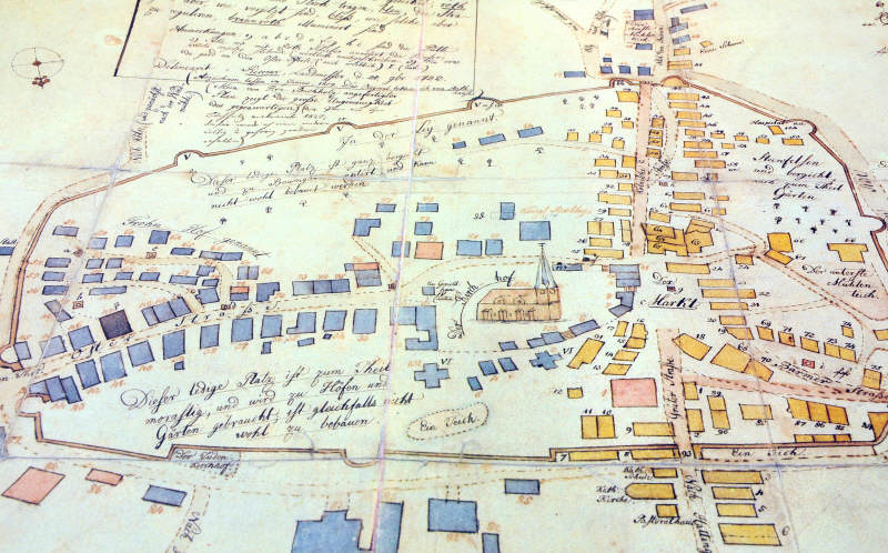 Die Vorlage dazu gab ein Grundrissplan von 1722, gezeichnet von Johann Ricœr, der im Auftrag von Konrektor Peter Heinrich Holthaus 1807 nachgezeichnet wurde. Im Jahr 1722 brach im Dachgeschoss eines Hauses am Markt ein Feuer aus, das schnell um sich griff und fast alle Häuser vom Kölner Tor bis zum Grütertor vernichtete. Auf dem Plan sind die vom Feuer zerstörten Häuser farblich markiert.